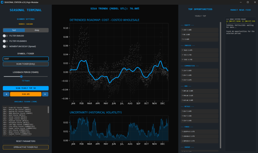 W tym sofcie możecie skanować nawet cały rynek, tu jest podpięte 79 rynków. Można tym sterować. Program wypluwa wam modele sezonowe z dokładnością procentową do danych historycznych i na tych coraz jaśniejszych (dane świeższe) kropkach macie zakres błędów modelu sezonowego. Skaner w czasie rzeczywistym przemiata wszystkie rynki i wypluwa wam listę albo top 50 w ujęciu rocznym albo top kilkanaście w ujęciu najbliższy miesiąc. Np. co jest okazją w kwietniu i bach! lista gotowa. Są możliwe 3 filtry skanera: jeden z nich ma wbudowane moje bandy zmienności! Inny patrzy na średnią SMA200 by wiedzieć na oko czy jest tanio czy drogo teraz. Ostatni filtr sprawdza czy rynek wyhamowywuje czyli czy spada jego momentum w odniesieniu do geometrii świec.